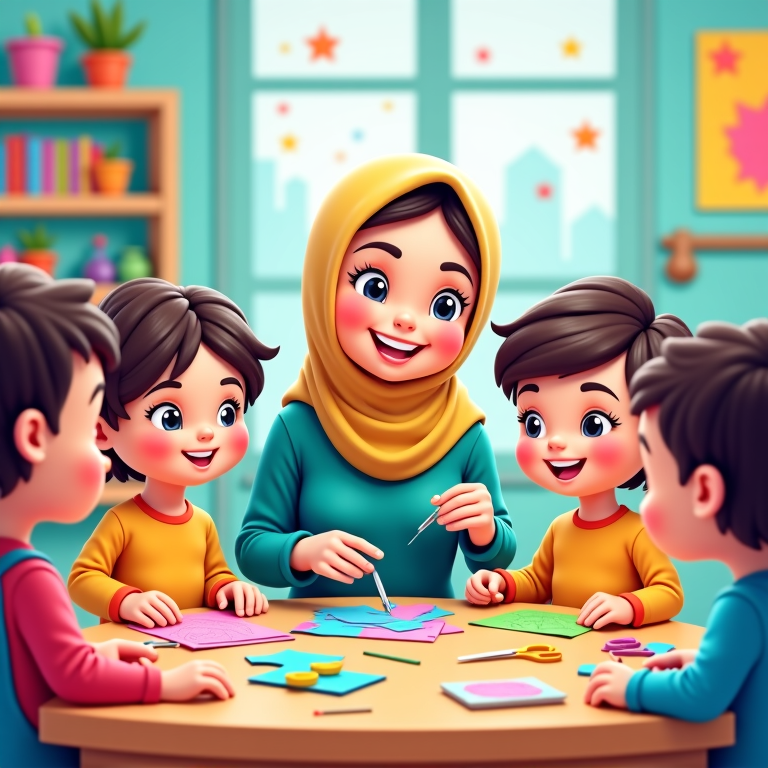 پس از پایان داستان، مربی کودکان را تشویق میکند تا با استفاده از تخیل و ابزارهای هنری، دستسازههای مرتبط با داستان خلق کنند. این فعالیت باعث تثبیت پیامهای داستان و پرورش خلاقیت کودکان میشود. - ابزارهای متنوع آموزشی: